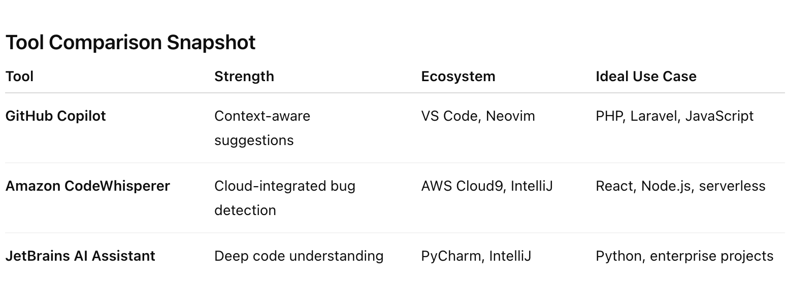 Debugging used to be about combing through logs and stack traces. Today, it’s a conversation with AI. Tools like Copilot and CodeWhisperer understand your codebase contextually and recommend precise, explainable fixes — turning frustration into flow.