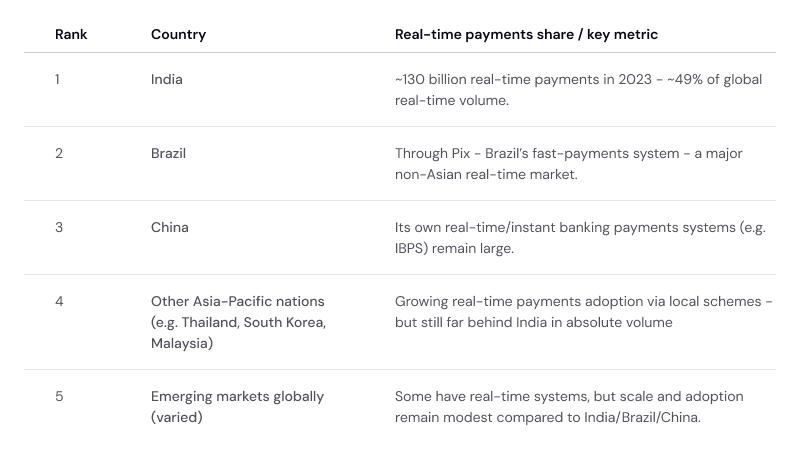 Note: precise ranking varies by data source - but every global instant-payment snapshot consistently places India at the top by volume and ubiquity.
